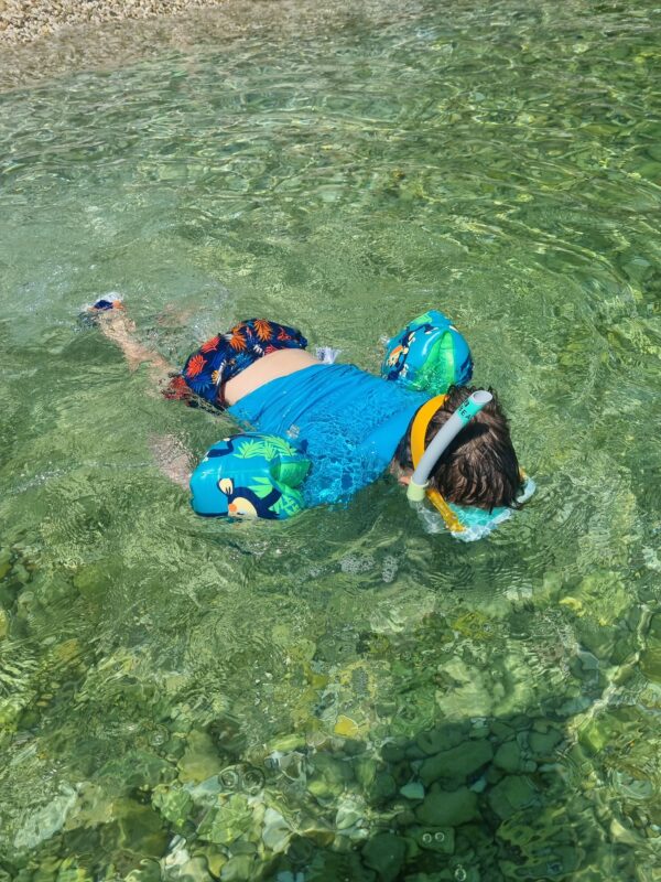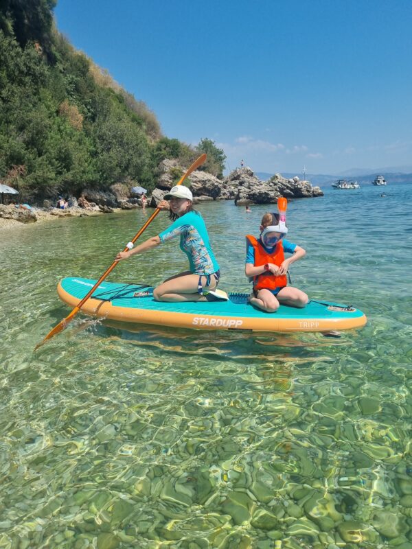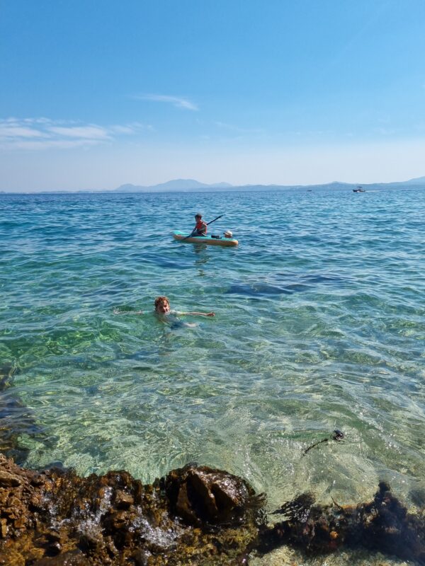 We took our paddle – the kids and I – and used it as a kayak to navigate to one of the many coves among the yachts and boats anchored in the bay. Zsolt took some pictures of us just as we started. The top layer of the water is so transparent that it looks as if the paddle is floating in the air above the blue water.
