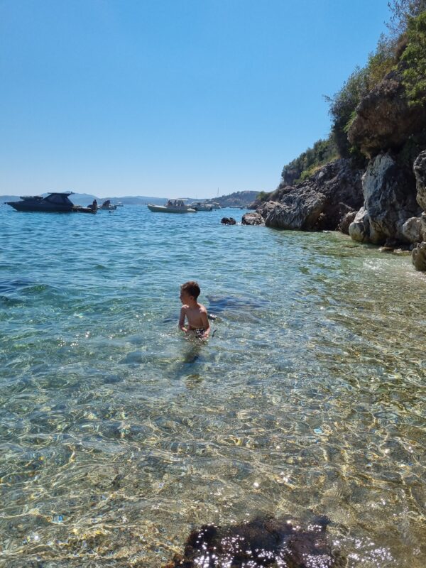 So I could sit in the cave and watch them, and olive trees, and the yachts and Corfu town right across the sea, and the foggy shores of Albania and mainland Greece, and the sea so transparent my kids seem to be floating above the pebbles, and the turquoise blending into blue and the sea blending into the land and the land blending into the sky.
