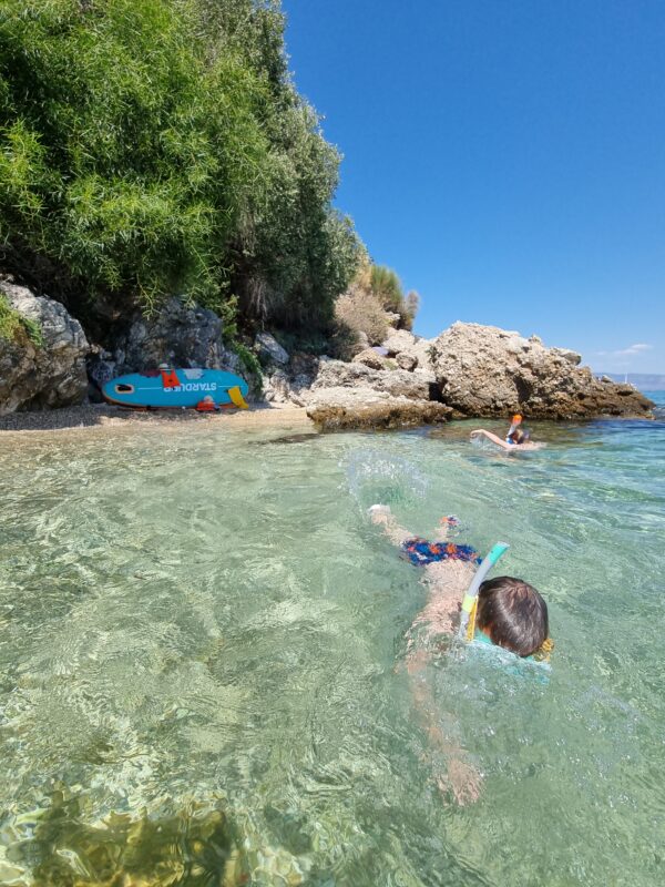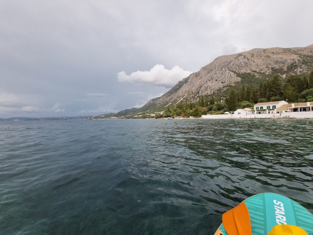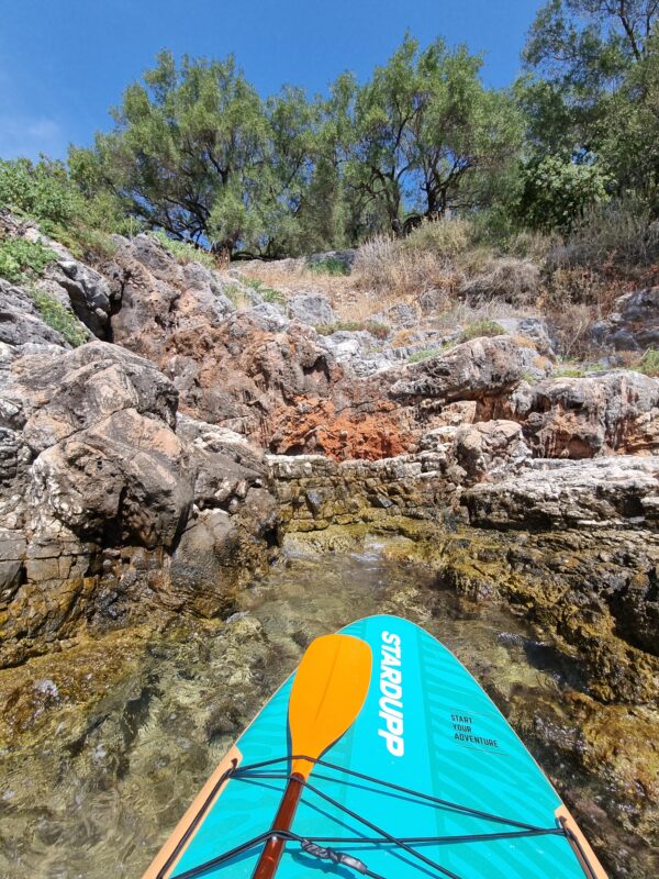 We went on an expedition on my paddleboard. Next to Barbati, the mountain Pantokrator looms over the sea. At the end of the beach, there is a stretch of the shore you cannot reach from the road, but can only access by water. The shore has many tiny beaches – just big enough for one or two towels – and also some small cool coves, with orange-brown walls and olive trees hanging above your head.